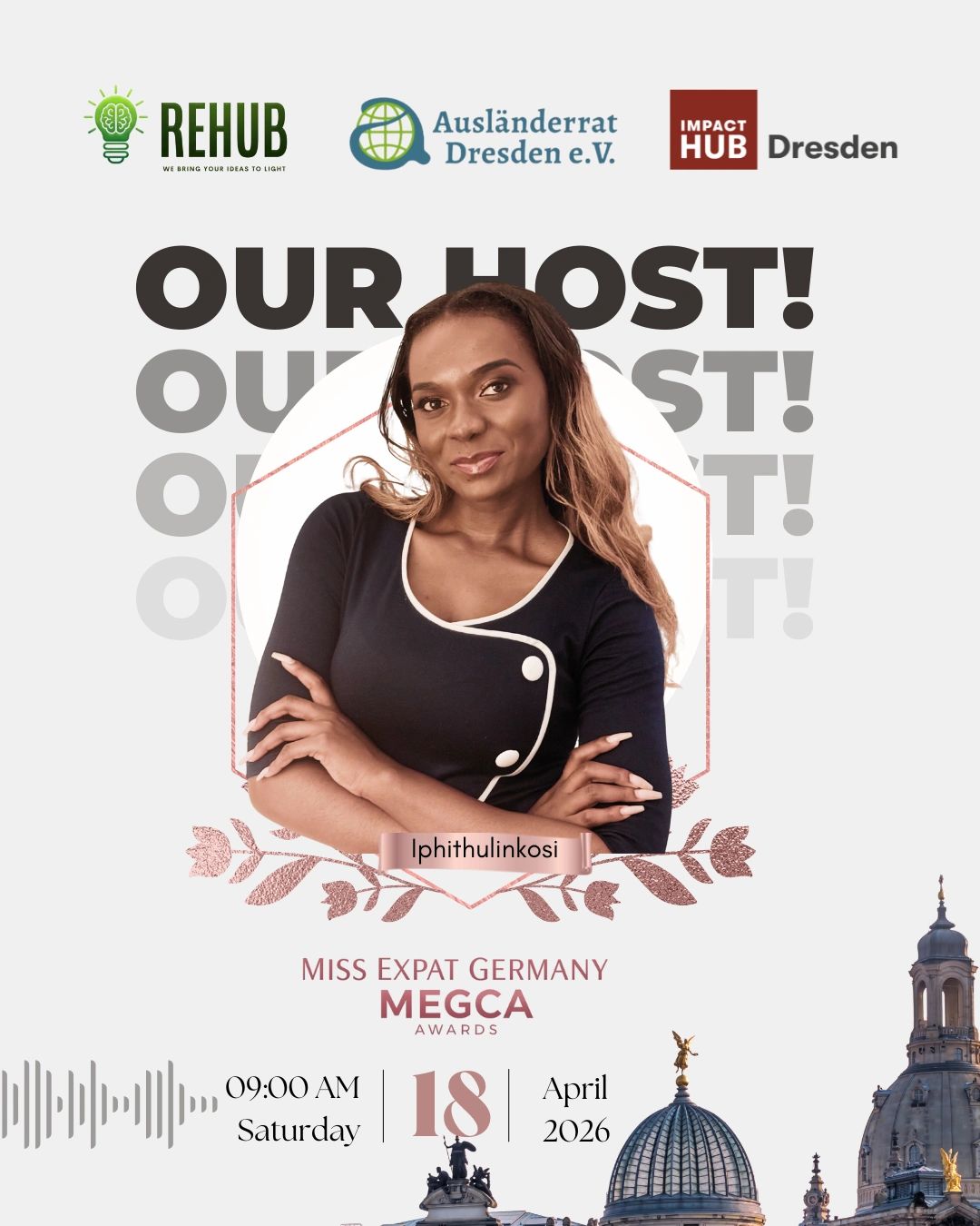 Die finale Titelträgerin Miss Expat Germany 2026, die von der Jury nach ihrem Live-Pitch ausgewählt wird, erhält das Teilnahmezertifikat des Ausländerrat Dresden e.V. sowie den Miss Expat Germany Award, der Folgendes umfasst: